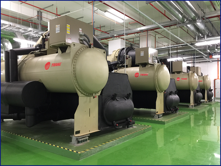 Large facilities operate central chilled water plants and cooling infrastructure that distribute cooling throughout production environments.